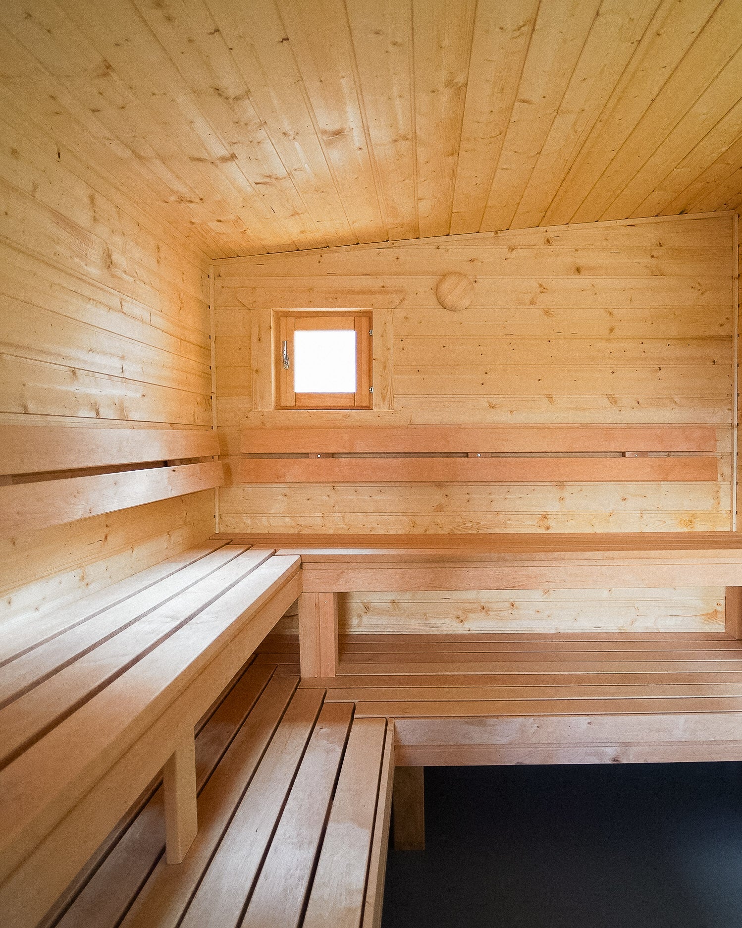 Our fully insulated 4-meter sauna is made for professional use. Designed to fit 14–16 sweaty guests, it features spacious L-shaped benches on two levels, offering both comfort and a great view through the large, dark-tinted panoramic window.